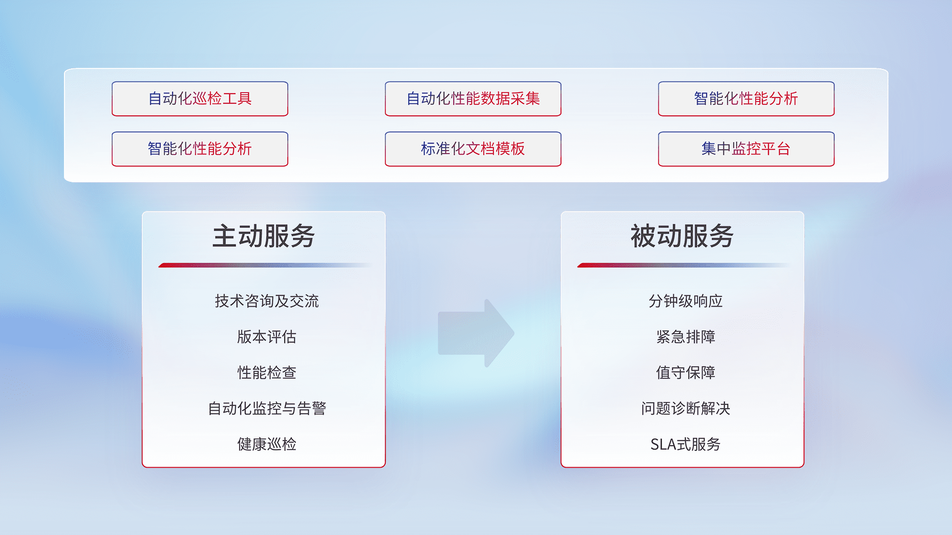 智能化工具和标准化文档,,,保障服务质量,,提供主动服务(包含技术咨询、、、版本评估、、、、性能检查、、自动化监控与告警、、、、健康巡检)和被动服务包含(分钟级响应、、紧急排障、、、值守保障、、问题诊断解决、、SLA服务)。。。。